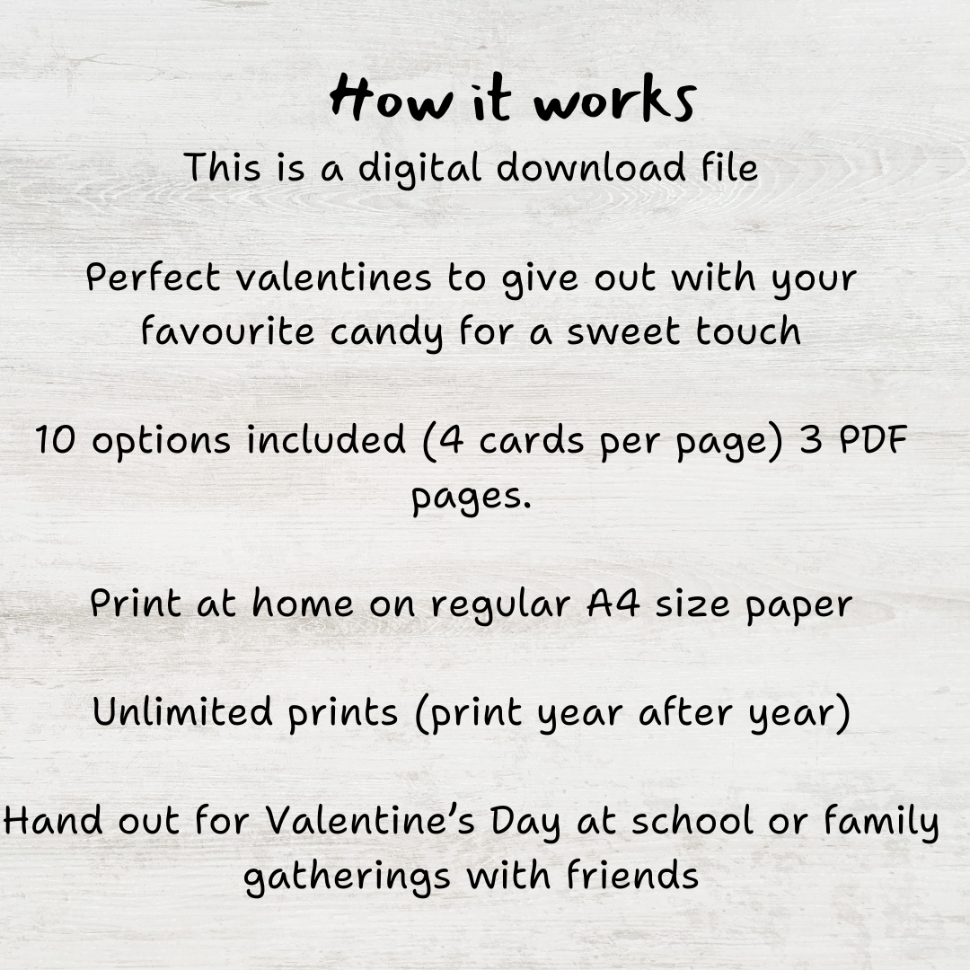 Make classroom Valentine’s Day gifting extra fun with this adorable set of printable cards! This download includes 12 unique Valentine designs, perfect to print, cut, and pair with their favorite treats or small gifts. Simply download instantly, print at home or your local print shop, and hand them out to classmates, friends, or teachers!